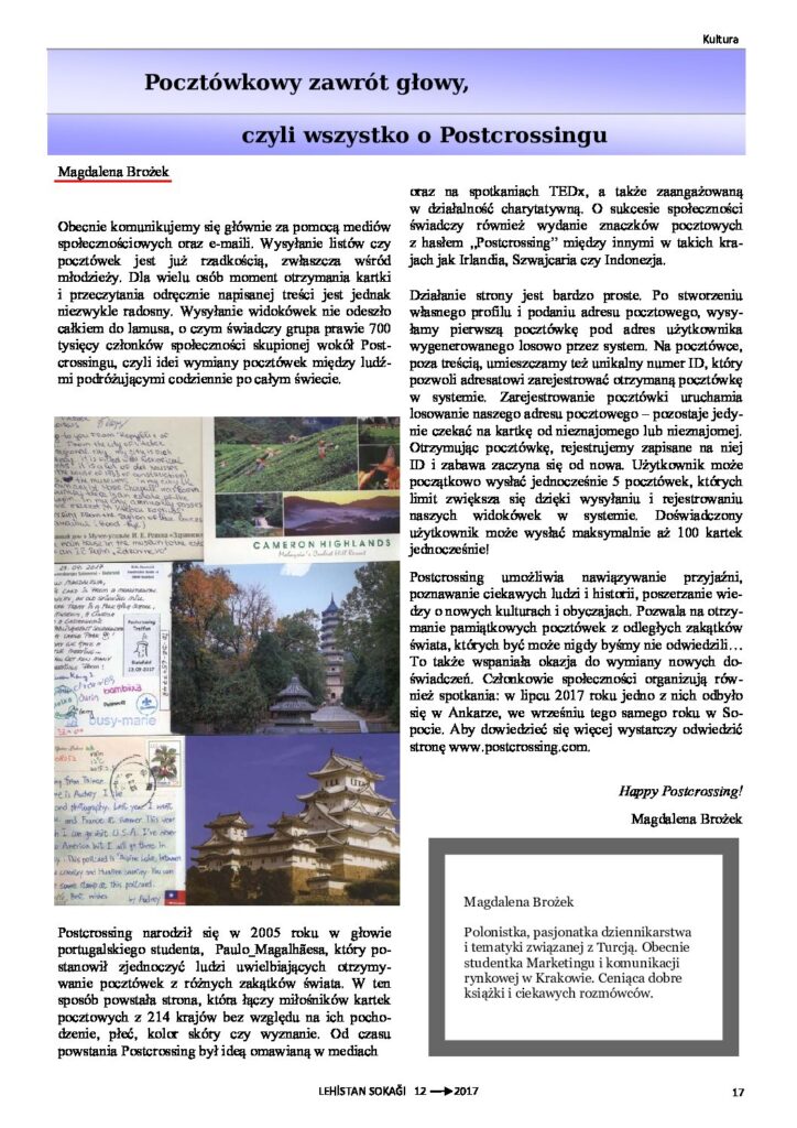Numer cztery to strona, która pozwala na zawarcie nowych znajomości z całego świata poprzez wymianę pocztówek. https://www.postcrossing.com/. Zamieszczam artykuł opublikowany w 2017 roku na łamach magazynu Lehistan Sokağı – Gazety Polonii Tureckiej, z którego dowiecie się więcej o Postcrossingu!