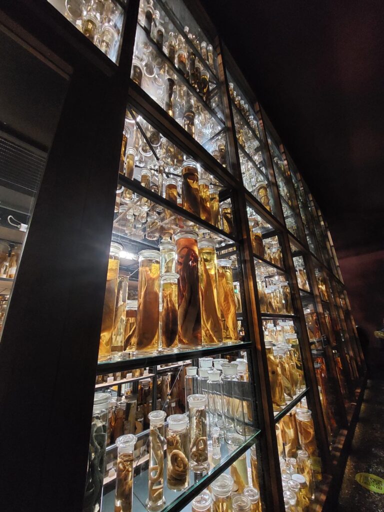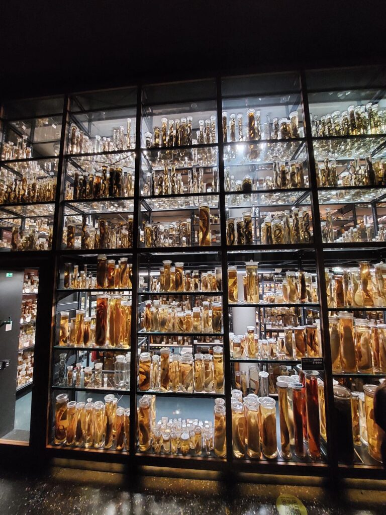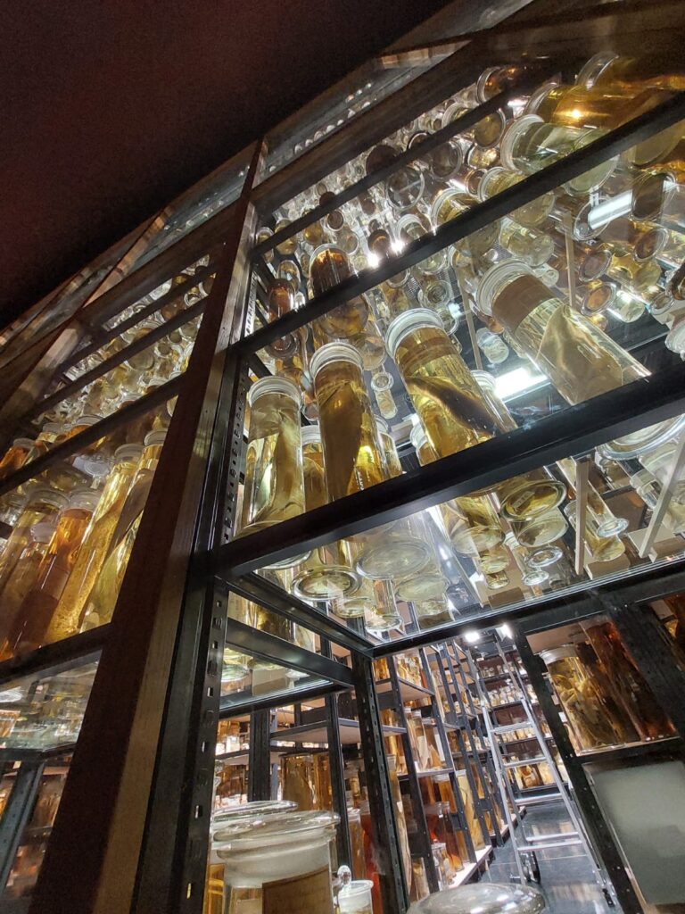 Kolejna sala to eksponaty konserwowane w alkoholu przechowywane w tak zwanych zbiorach mokrych. W regałach sięgających 3 metrów umieszczono pojemniki z zanurzonymi w nich rybami oraz innymi organizmami wodnymi np. gadami lub płazami. Wejście do sali robi ogromne wrażenie, a mi skojarzyło się ze sceną walki w Ministerstwie Magii z piątej części Harry’ego Pottera. Zobaczcie sami: