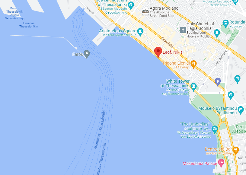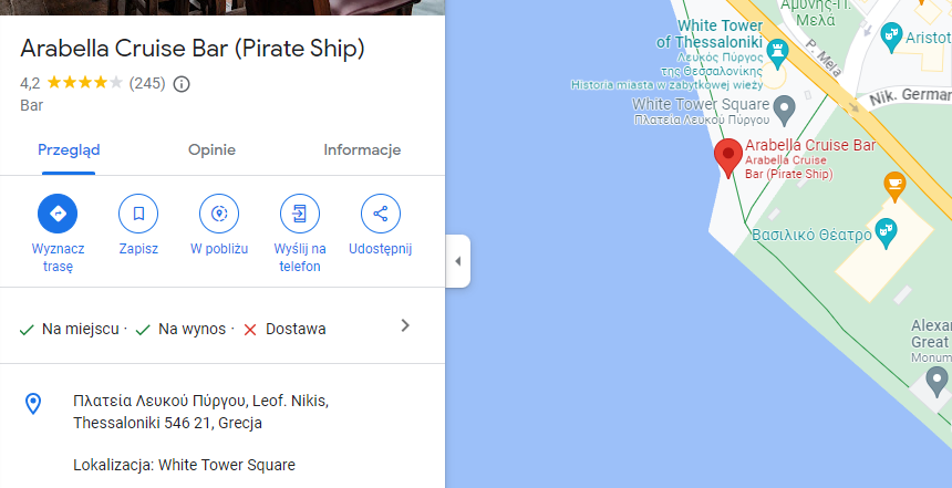 Arabella Cruise Bar, czyli wspomniana wyżej “piracka restauracja”; Adres: Πλατεία Λευκού Πύργου, Leof. Nikis, Thessaloniki 546 21, Grecja, google.maps